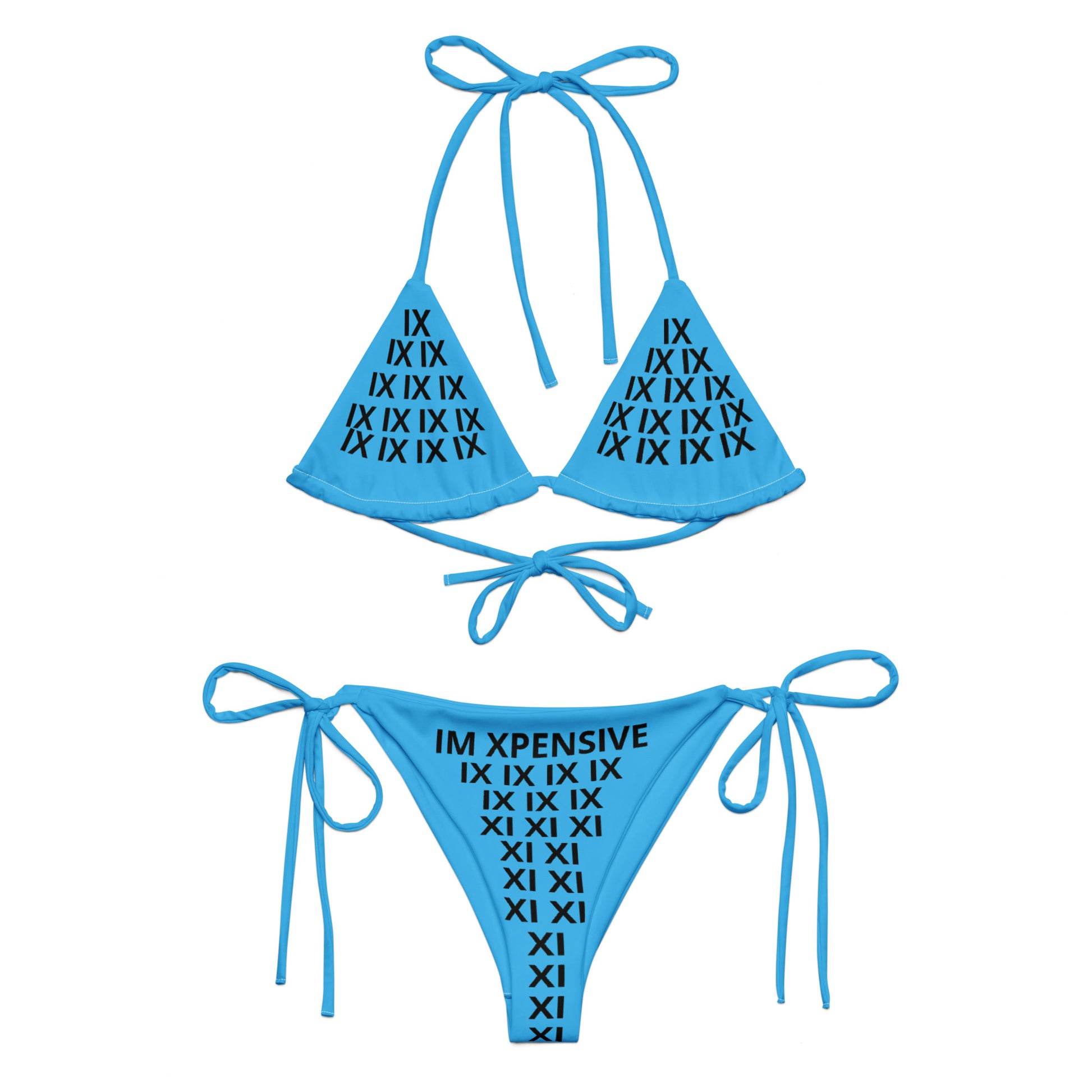 Introducing I'm Expensive IX recycled string bikini. Get ready for a stylish and comfortable summer experience with this all-over print recycled polyester bikini set. Double-layering with UPF 50+ provides protection from the sun's harmful rays while its customizable straps let you create multiple looks for different occasions. It is ready-to-wear swimwear with a luxurious look and feel that is sure to make you stand out on your next beach day in the sun!