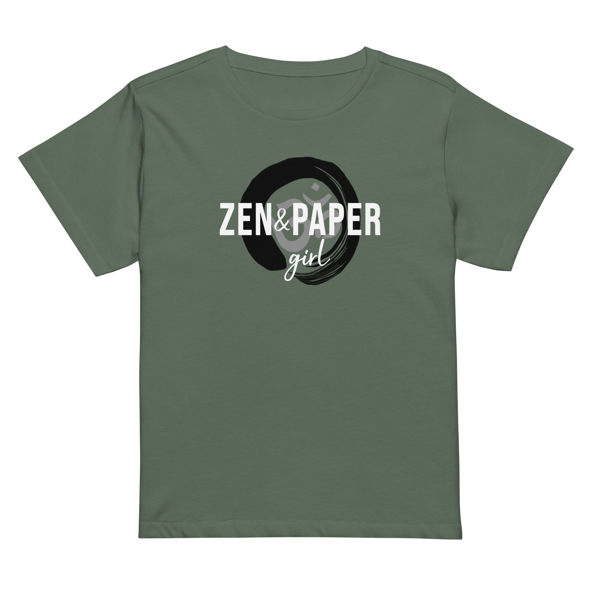 From small to plus-size you'll love how this tee looks on you! Designed to provide the perfect combination of style and comfort, this longline fit, crew neck t-shirt is crafted from 100% combed and ring-spun cotton for an ultra-soft and smooth feel against the skin. Our Zen & Paper Girl Logo Women’s high-waisted T-shirt is perfect for pairing with any high-waisted bottoms for an effortless look. With its loose tummy, this tee offers a flattering design, you're sure to turn heads in this luxury look!